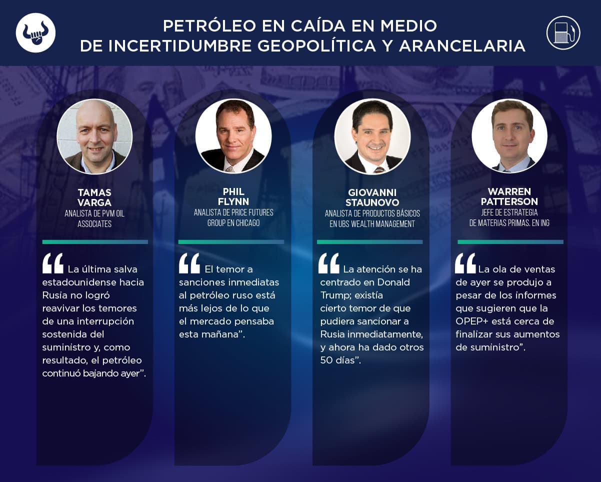 - Trump dijo que impondría aranceles secundarios del 100% a cualquier país que compre exportaciones rusas si Moscú no llega a un acuerdo de paz con Ucrania en los próximos 50 días, apuntando a India, China y Turquía, los tres mayores compradores de petróleo ruso.