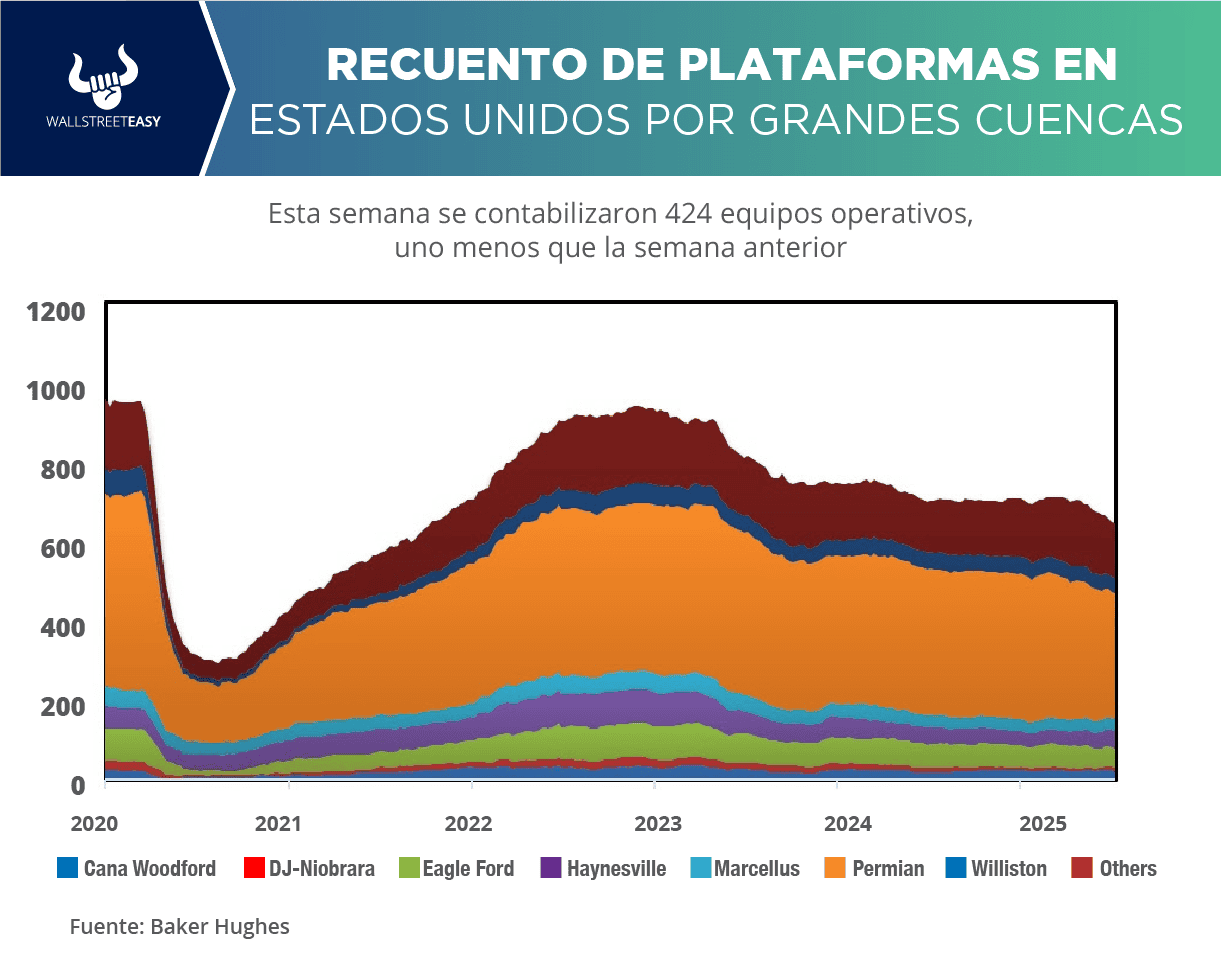 Baker Hughes, actualmente en EEUU se encuentran 537 equipos activos (incluyendo los de gas). En la actividad petrolera se contabilizaron 424, uno menos que la semana anterior. En las operaciones de gas hay 108 equipos operativos, mismo número que hace siete días. Hace un año estaban activas 584 plataformas.