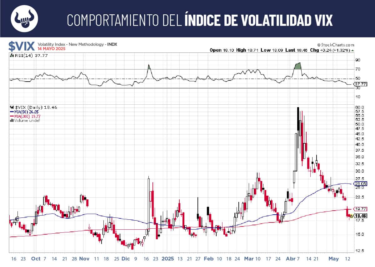 El índice VIX cayó por debajo del nivel de 19, lo cual no se veía desde marzo. Esto indica una salida significativa de posiciones defensivas en opciones put hacia una postura más neutra, o incluso alcista.