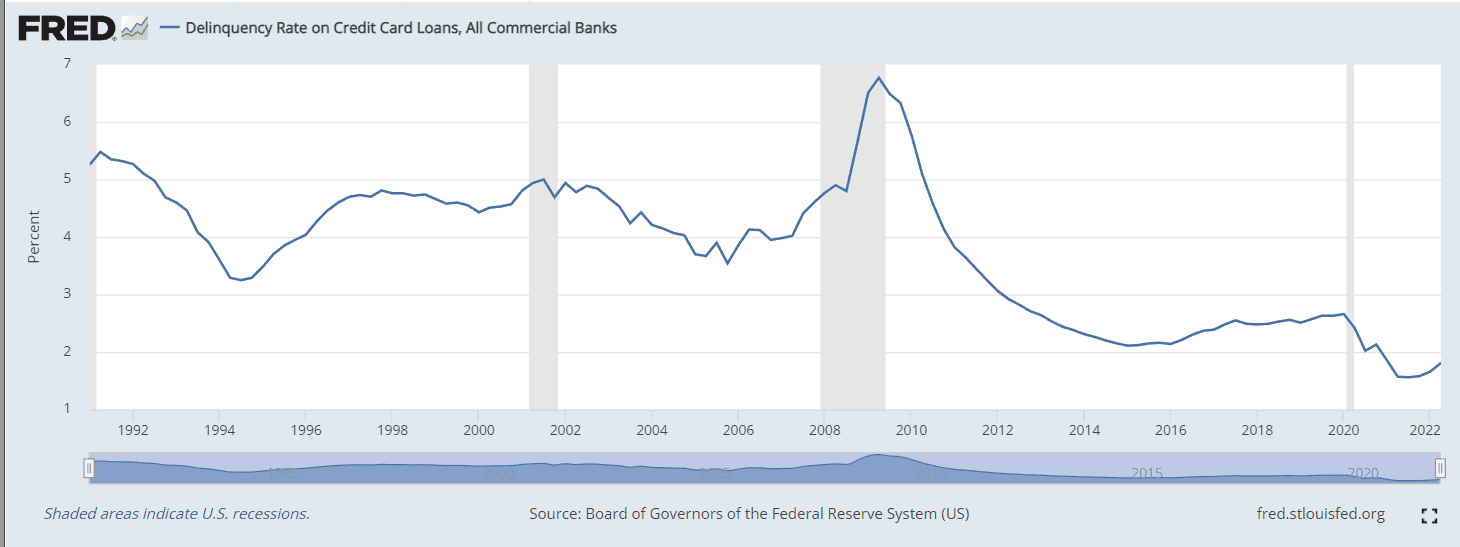 Al ver la salud crediticia del consumidor en Estados Unidos, vemos que los impagos de tarjetas de crédito van en aumento, pero siguen muy cerca del récord a la baja que, a niveles vividos en otras crisis, algo que mucho antes de la debacle financiara de 2008 ya se veía muy elevado, es decir, en los años 2006 y 2007.