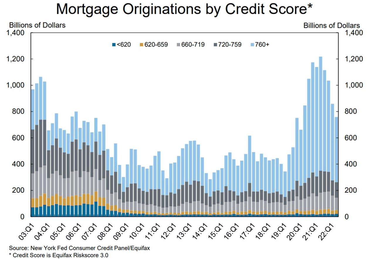 También vemos que los créditos de las hipotecas están destinados a personas con créditos excelentes, o por encima de 700 puntos en sus reportes de crédito, un paralelismo importante con respecto a 2008, cuando más de 25% de las hipotecas correspondía a personas con créditos por debajo de 600.