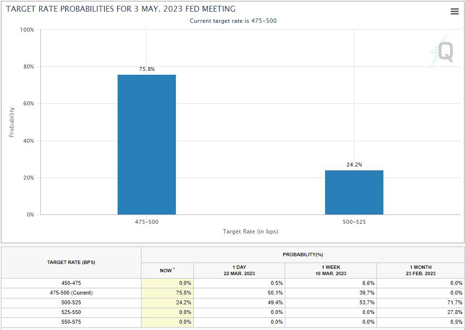 Al correr del día hemos visto al VIX avanzar de manera importante, lo cual ha ido reduciendo las ganancias del mercado, y al cierre de esta edición, estamos en pérdidas. Este tipo de avances en el VIX, al mismo tiempo que el mercado de bonos da señales de compras importantes, generalmente son síntomas sistémicos, pero ante la falta de noticias, no queda otra que preguntarse si será miedo a que la situación bancaria siga complicando a la FED. Veremos si no hay nuevos titulares en las próximas horas.