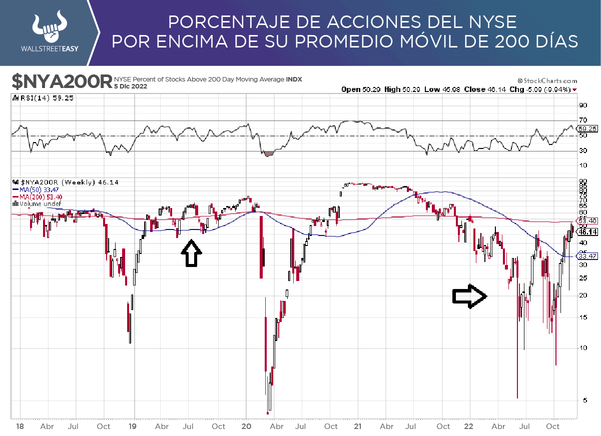 Lo importante sería que la cantidad de acciones por encima de su promedio móvil de 200 días se mantenga elevada y trate de superar los niveles de 50%. Actualmente está en 46%, por lo que lo más sano del mercado sería ver una toma de ganancias al estilo de 2019.
