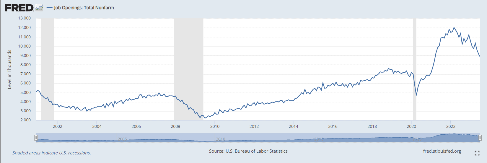 Hoy el reporte JOLTS arrojó una cantidad de posiciones abiertas sin conseguir empleados de 8,82M vs 9,46M esperados y de paso una reducción de 338 mil posiciones abiertas en el reporte anterior, que fue revisado en este reporte.