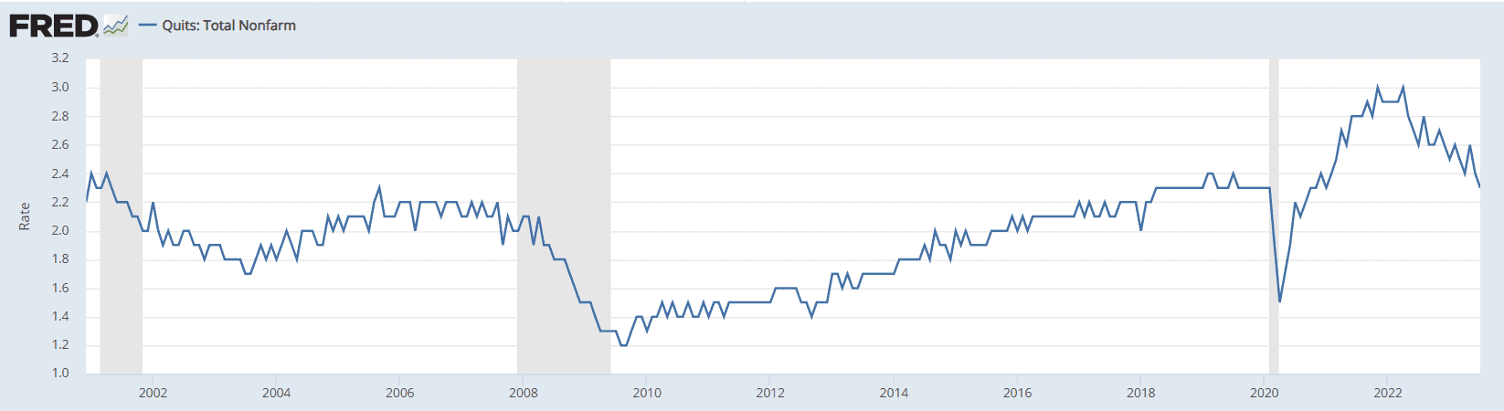 Así que este importante medidor, muy usado por la Reserva Federal, indica que el mercado laboral efectivamente se está enfriando y ya está en niveles de 2021. No solo eso, sino que hay una cantidad considerablemente menor de empleados renunciando a sus puestos, cifra que también regresa a niveles pre pandemia.