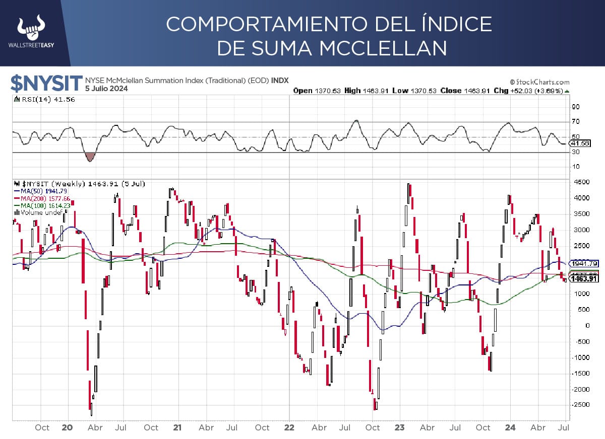 OTRA NOVEDAD El índice de suma McClellan muestra que la continuación del rally a mediano plazo es probable, por el simple hecho de que han participado tan pocas acciones, que si más acciones empiezan a sumarse es probable que los mercados se mantengan al alza, pero siendo otros sectores los generadores del rally.