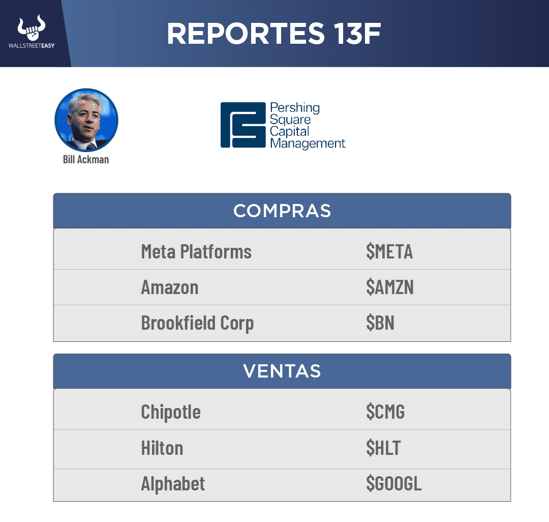 • Ackman está rotando sus ganancias de consumo físico (Chipotle/Hilton) hacia la infraestructura digital y la escala publicitaria de Meta y Amazon.