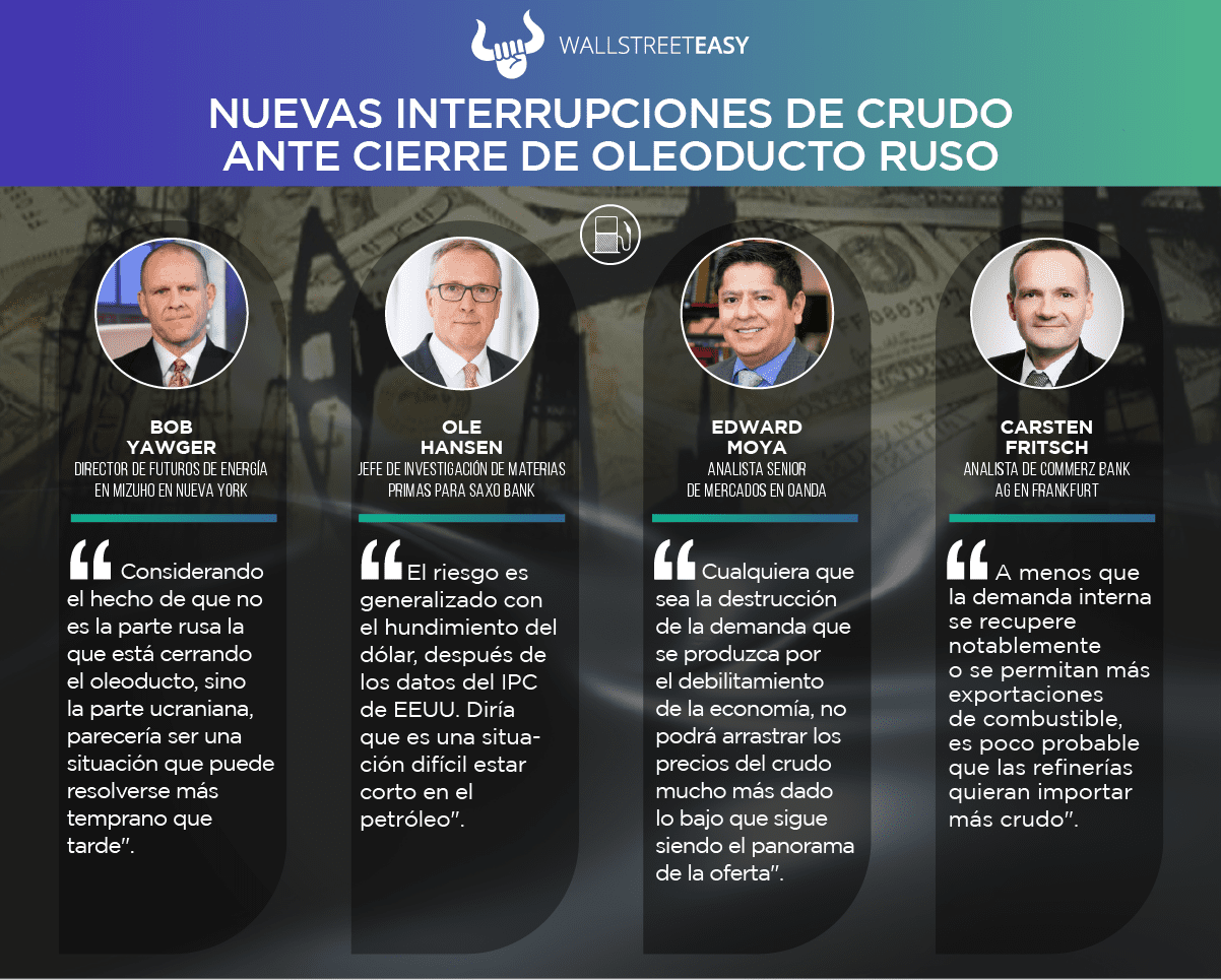 - Según la empresa de transporte rusa Transneft, Ucrania ha detenido los flujos del oleoducto ruso hacia Europa Central, supuestamente porque las sanciones le impedían aceptar las tasas de tránsito, poniendo en peligro el suministro de crudo a países como Hungría, Eslovaquia y la República Checa.