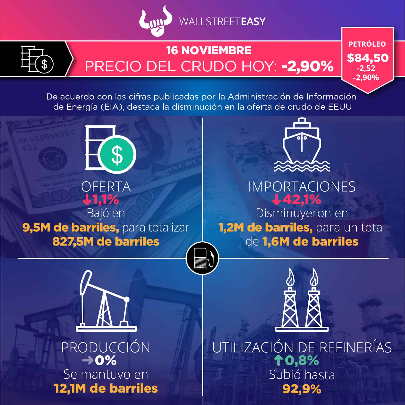 Al cierre de esta edición, el precio del barril bajó hasta $84,50, lo que representa -2,90% en comparación con el día martes.