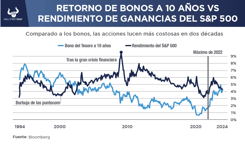 Si se puede obtener un rendimiento más alto de los bonos del Tesoro, prácticamente sin riesgo, tendría sentido que las acciones fueran un poco más baratas y, por lo tanto, pagaran un rendimiento más alto, para compensar el riesgo adicional.