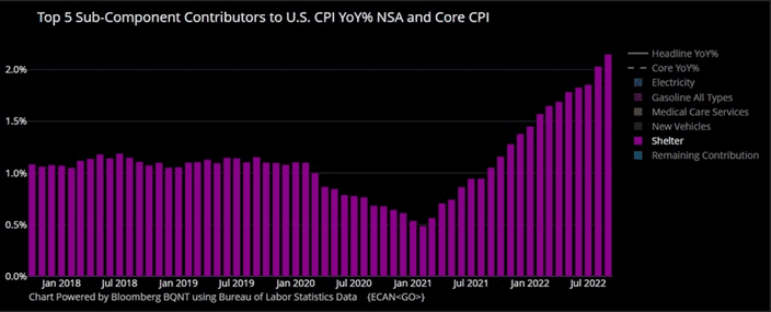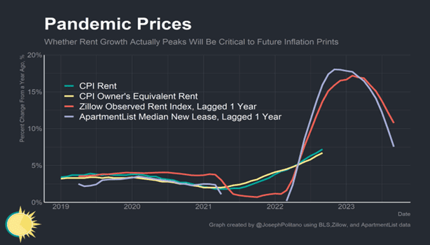 El mayor componente del costo de alquiler es la variable shelter, que la oficina de estadísticas laborales de Estados Unidos calcula basándose en una encuesta realizada a personas que recientemente se mudaron. Lo que termina pasando es que quien responde la encuesta se mudó hace unos meses, y no necesariamente el mismo mes en que se toma la muestra, explicando por qué hay un atraso tan importante en la data.