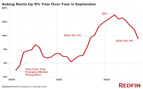 La inflación de las rentas muestra una situación fuera de control, en contraposición a lo que estamos viendo en los indicadores líderes del sector. Por ejemplo, si usamos los precios de la página de venta y alquileres Redfin, vemos que la inflación del sector se está desacelerando de manera importante en su comparación anual, y el mes pasado tuvimos la primera caída mensual en los precios, casi un 2%.