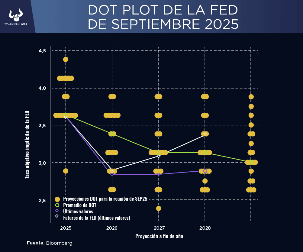 DAME CONTEXTO Esta unanimidad fue el dato más curioso y revelador, ya que indica una cohesión interna y una postura más conservadora de lo que el mercado había anticipado. A pesar de las expectativas de algunos de que la FED actuaría con mayor agresividad, la mayoría de los gobernadores se alineó en una dirección más cautelosa, lo que sugiere que las presiones externas no tuvieron el efecto deseado. ¿ENTONCES? El presidente de la FED, Jerome Powell, utilizó su conferencia de prensa para dar más peso al mercado laboral en el mandato del banco central, junto con la inflación. Powell reconoció que la demanda de empleo ha disminuido y que el ritmo de creación de puestos de trabajo se encuentra por debajo de la tasa necesaria para mantener el desempleo constante. ¿ALGO MÁS? Se cuidó de no dar garantías sobre el futuro. Enfatizó que la situación se evaluará en cada una de las próximas reuniones y que el recorte visto de tasas fue un recorte de gestión de riesgos. Estas declaraciones reflejan la incertidumbre que el banco central enfrenta ante un panorama económico complejo. ¿OTRO DATO RELEVANTE? La gráfica de puntos trimestral del FOMC, que proyecta el camino futuro de las tasas, tampoco mostró cambios drásticos. Así es como ha cambiado el promedio de sus predicciones sobre las tasas de los fondos federales al final de cada uno de los próximos tres años desde el último diagrama de puntos de junio.