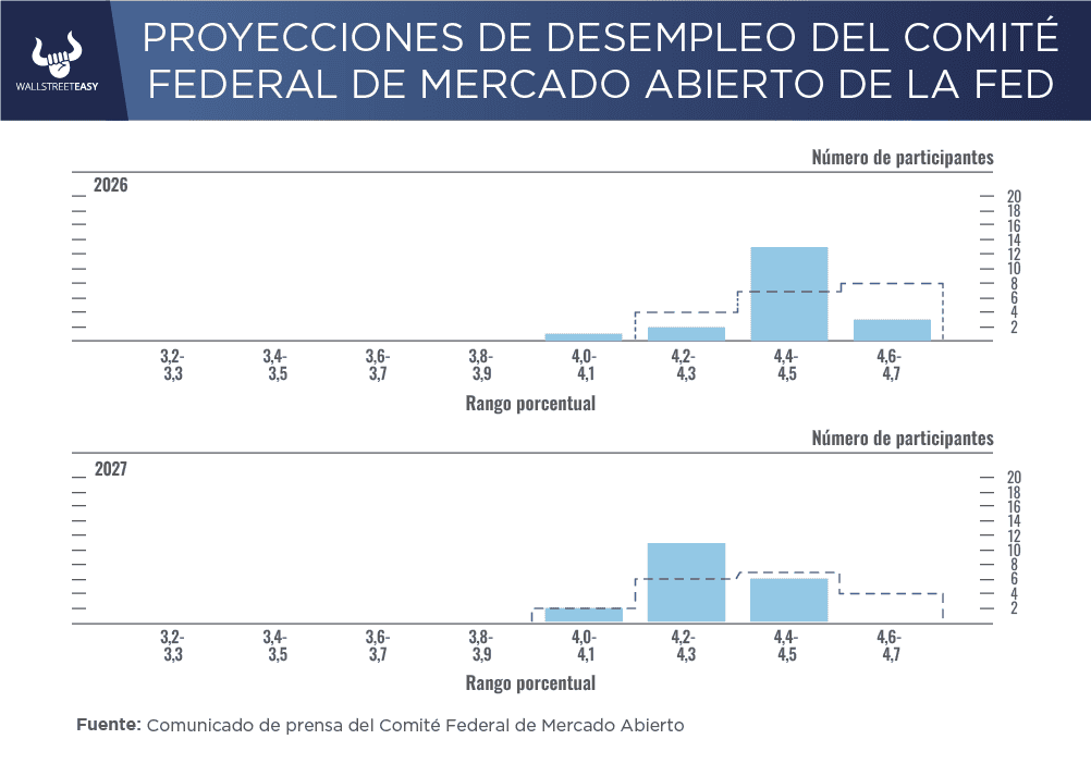 ¿QUÉ MÁS PASÓ? Aunque se inclinó ligeramente hacia tasas más bajas, la mayoría del comité espera que la tasa de referencia se mantenga por encima del 3% hasta finales de 2027. Esto contrasta notablemente con las preferencias políticas del presidente Donald Trump, quien ha expresado su deseo de una tasa del 1%. Esta discrepancia subraya la tensión entre la independencia de la FED y las presiones políticas. ¿OTRO ACONTECIMIENTO? Analizando las proyecciones de desempleo, aunque los miembros de la FED están nerviosos por el mercado laboral, su expectativa promedio para 2026 y 2027 es ligeramente inferior a la que tenían en junio. Esto indica que, en general, no anticipan un deterioro significativo. La única excepción a esta cautela fue la proyección del gobernador Stephen Miran, quien sugirió un recorte drástico. POR ÚLTIMO En el gráfico a continuación, la línea punteada muestra cuántos participantes esperaban diferentes tasas de desempleo en junio, mientras que las barras continuas muestran sus expectativas actuales. Tanto para 2026 como para 2027, son más bajas: