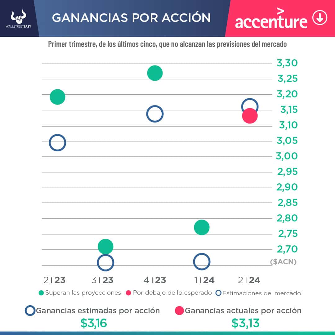- Accenture obtuvo beneficios ajustados de $3,13 por acción, con ingresos de $16.470M. Los analistas esperaban beneficios de $3,16 por acción e ingresos de $16.560.