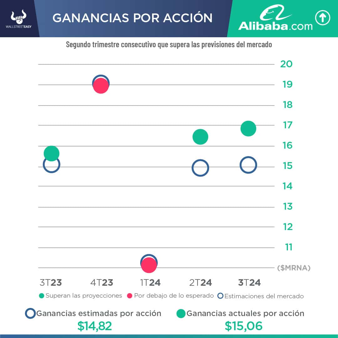 • El beneficio ajustado por acción de Alibaba fue de 15,06 yuanes ($2,15), con ventas de 236.500M de yuanes ($33.700M). Los analistas esperaban un beneficio ajustado de 14,82 yuanes ($2,11) por acción y ventas de 239.500M de yuanes.
