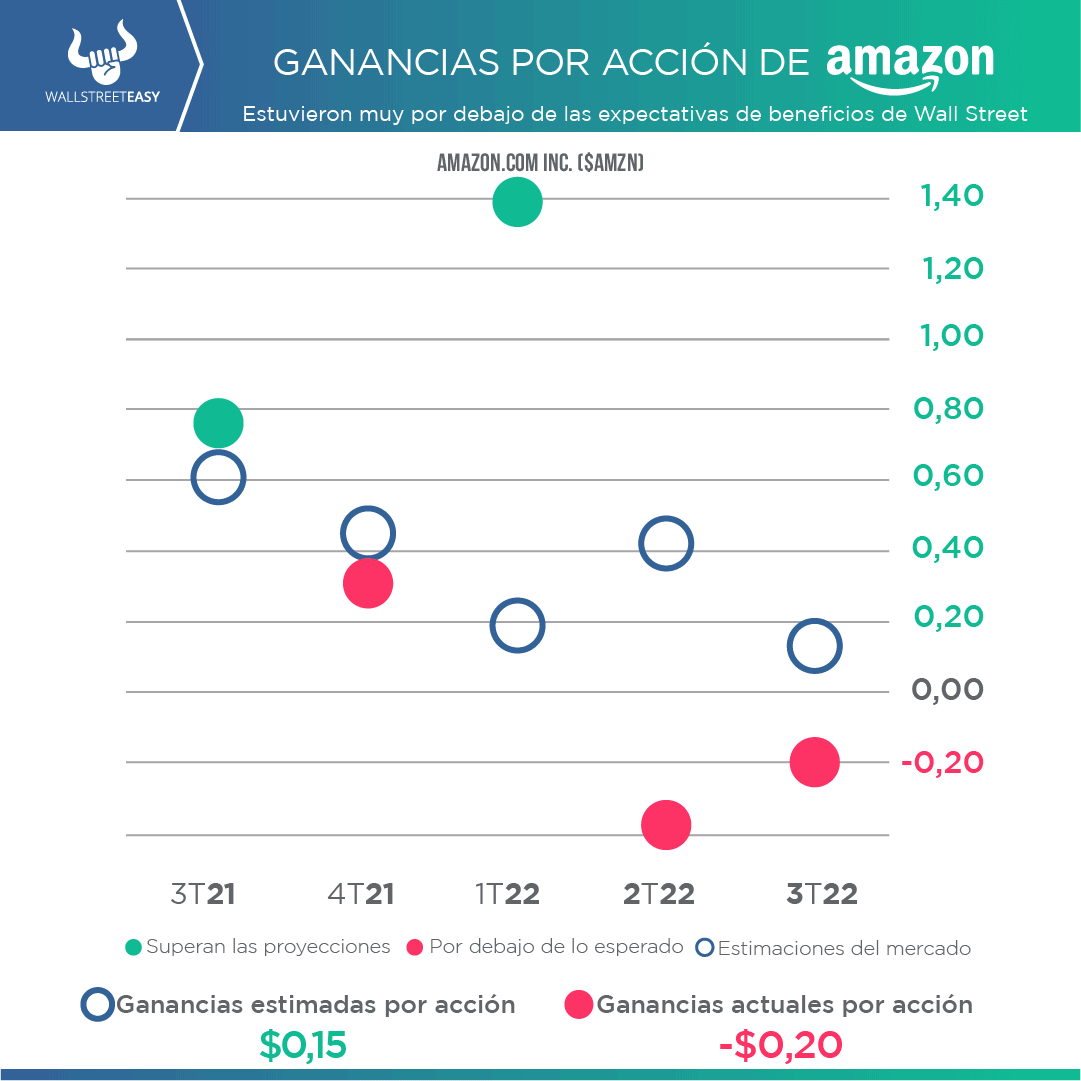 • La compañía con sede en Seattle dijo que tuvo una pérdida de 20 centavos por acción, que ajustados por costos no recurrentes, fueron de 10 centavos, que no alcanzaron el beneficio estimado de 15 centavos. Además, obtuvo ingresos de $121.230M, superando las previsiones de $119.670M, mientras que Amazon Web Services $19.700M vs. $19.560M esperados, y en publicidad, fue $8.760M vs. $8.650M proyectados.