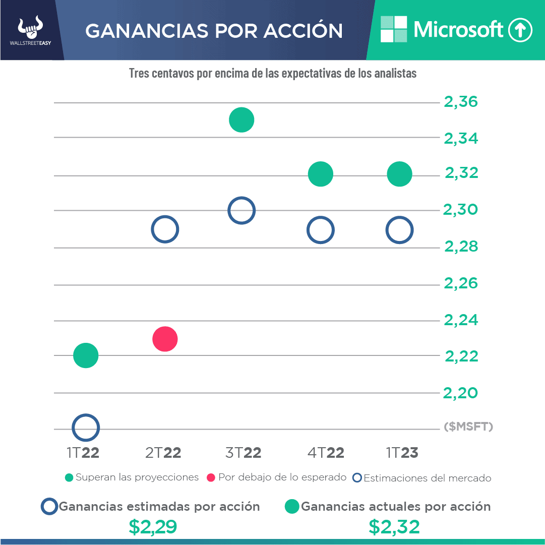 • Los beneficios por acción fueron de $2,32 por acción, frente a los $2,29 por acción que esperaban los analistas, mientras que los ingresos se situaron en $52.750M, un poco por debajo de las estimaciones de $52.940M. Microsoft preveía entre $50.500M y $51.500M de ingresos en el trimestre, lo que equivale a un crecimiento implícito del +3%, aunque los analistas esperaban $52.430M.
