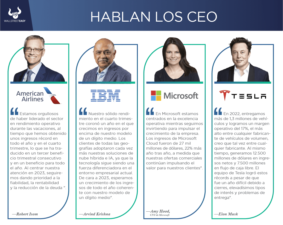 LA NOTICIA En una nueva semana de reportes de ganancias del cuarto trimestre de 2022, veremos cómo les fue a American Airlines Group Inc. ($AAL); Colgate-Palmolive Co. ($CL); IBM ($IBM); Microsoft Corp. ($MSFT); Tesla Inc. ($TSLA) y Visa Inc. ($V). PONME AL DÍA American Airlines superó las expectativas de los analistas, ya que la fuerte demanda de viajes y las elevadas tarifas impulsaron los resultados durante una turbulenta temporada de vacaciones: