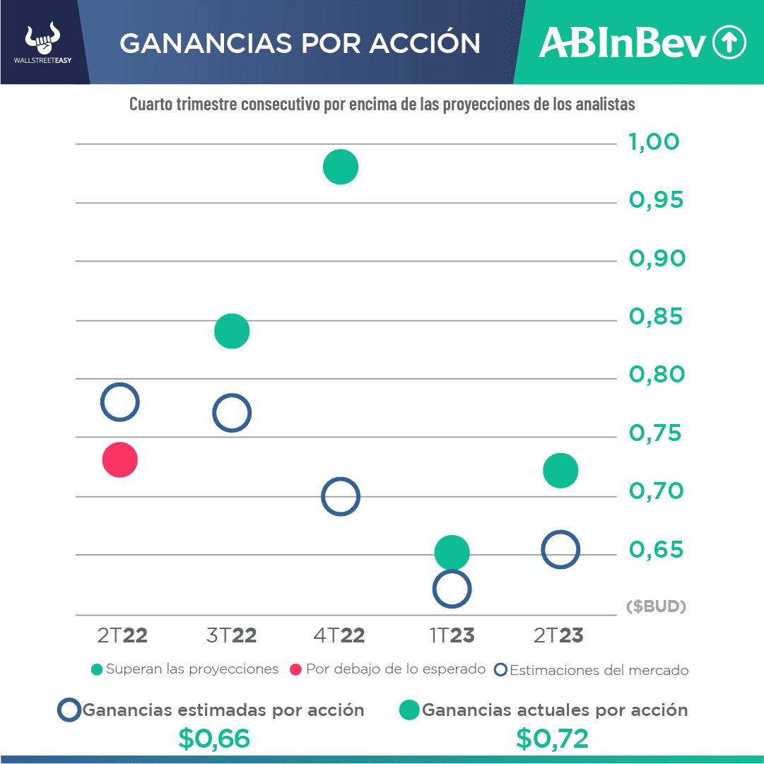 - La cervecera anunció beneficios de $339M en el trimestre. Por acción, la empresa con sede en Bélgica obtuvo un beneficio ajustado de 72 céntimos por acción, por encima de la estimación de 66 céntimos por acción. Además, ingresos de $15.120M, por debajo de las previsiones de Wall Street de $15.330M.