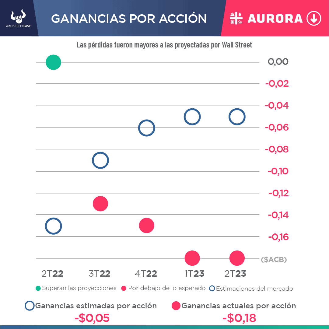 - Aurora Cannabis no alcanzó las pérdidas estimadas, ya que tuvo una pérdida de -$0,18, mientras que la proyección de pérdida era de -$0,05, mientras que los ingresos de la empresa aumentaron en 7,54M con respecto al mismo periodo del año anterior.