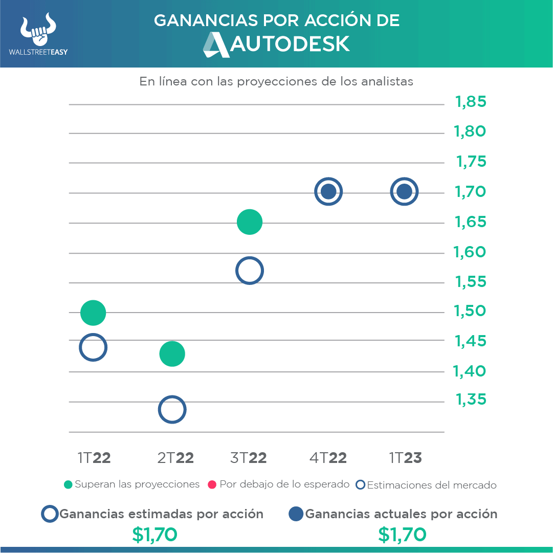 • Para el trimestre actual, que finaliza en enero, Autodesk espera que sus beneficios por acción oscilen entre $1,77 y $1,83, por encima de las expectativas del mercado de $1,66. La empresa espera ingresos de entre $1.300M y $1.320M para el trimestre actual, por encima de lo esperado de $1.270M.