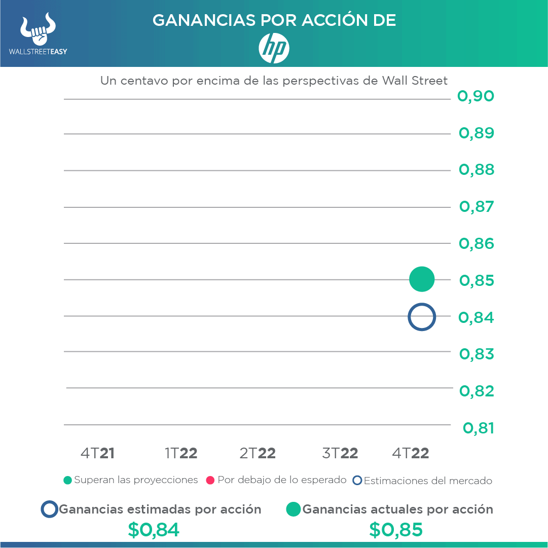 • HP obtuvo unos ingresos de $14.800M en el trimestre finalizado en octubre de 2022, por encima de la proyección en 1,16%, que se compara con los ingresos del año anterior de $16.680M. La empresa ha superado las estimaciones de ingresos del consenso tres veces en los últimos cuatro trimestres.