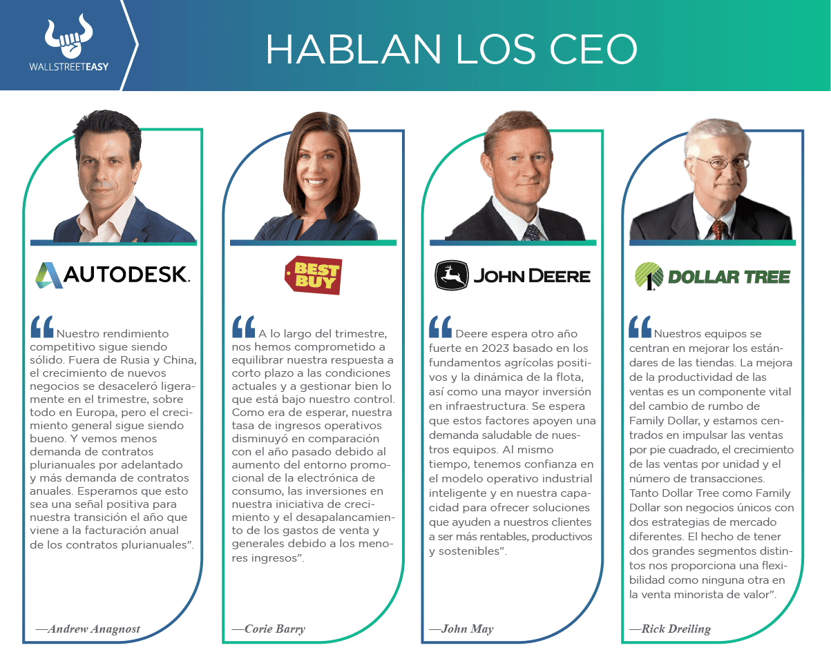 LA NOTICIA En una nueva semana de reportes de ganancias del tercer trimestre de 2022, veremos cómo les fue a Autodesk Inc. ($ADSK); Best Buy Co Inc. ($BBY); Deere & Co. ($DE); Dollar Tree Inc. ($DLTR); HP Inc. ($HPQ), y The J.M. Smucker Co. ($SJM). PONME AL DÍA Autodesk presentó un informe de resultados en línea, pero la empresa recortó sus previsiones de facturación para todo el año: