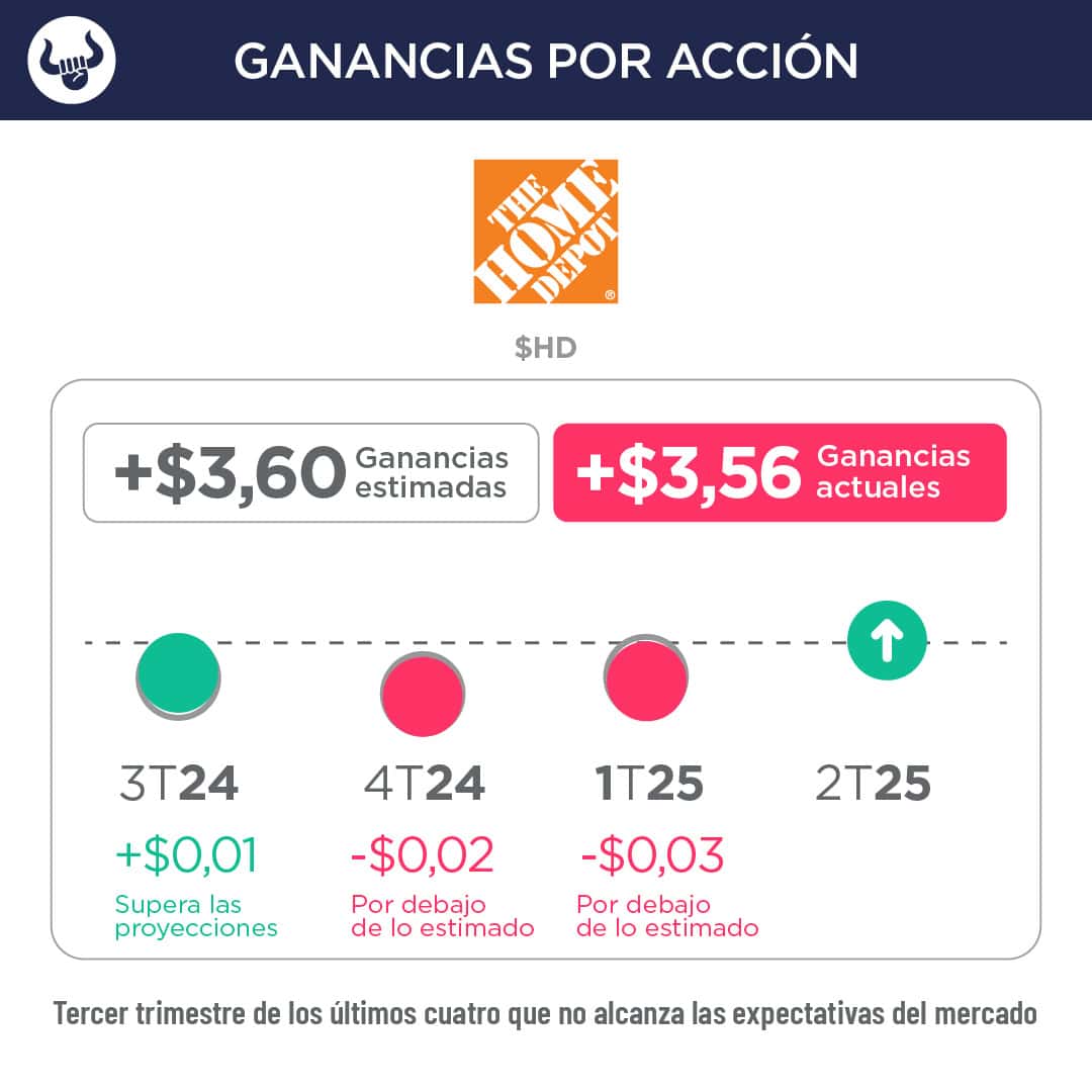 - El minorista del hogar obtuvo beneficios por acción de $3,56, ajustado frente a los $3,60 esperados, e ingresos de $39.860M, por encima de la previsión de $39.310M.