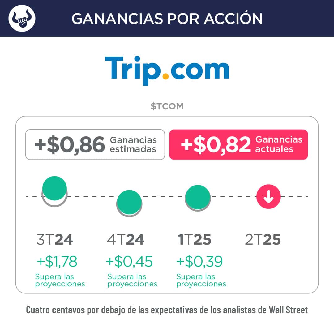 - Trip.com registró unos ingresos de $1.910M en el trimestre finalizado en marzo de 2025, por debajo de la estimación en 0,25%. Esto se compara con los ingresos del año anterior de $1.650M. En los últimos cuatro trimestres, la empresa ha superado dos veces las estimaciones de ingresos.
