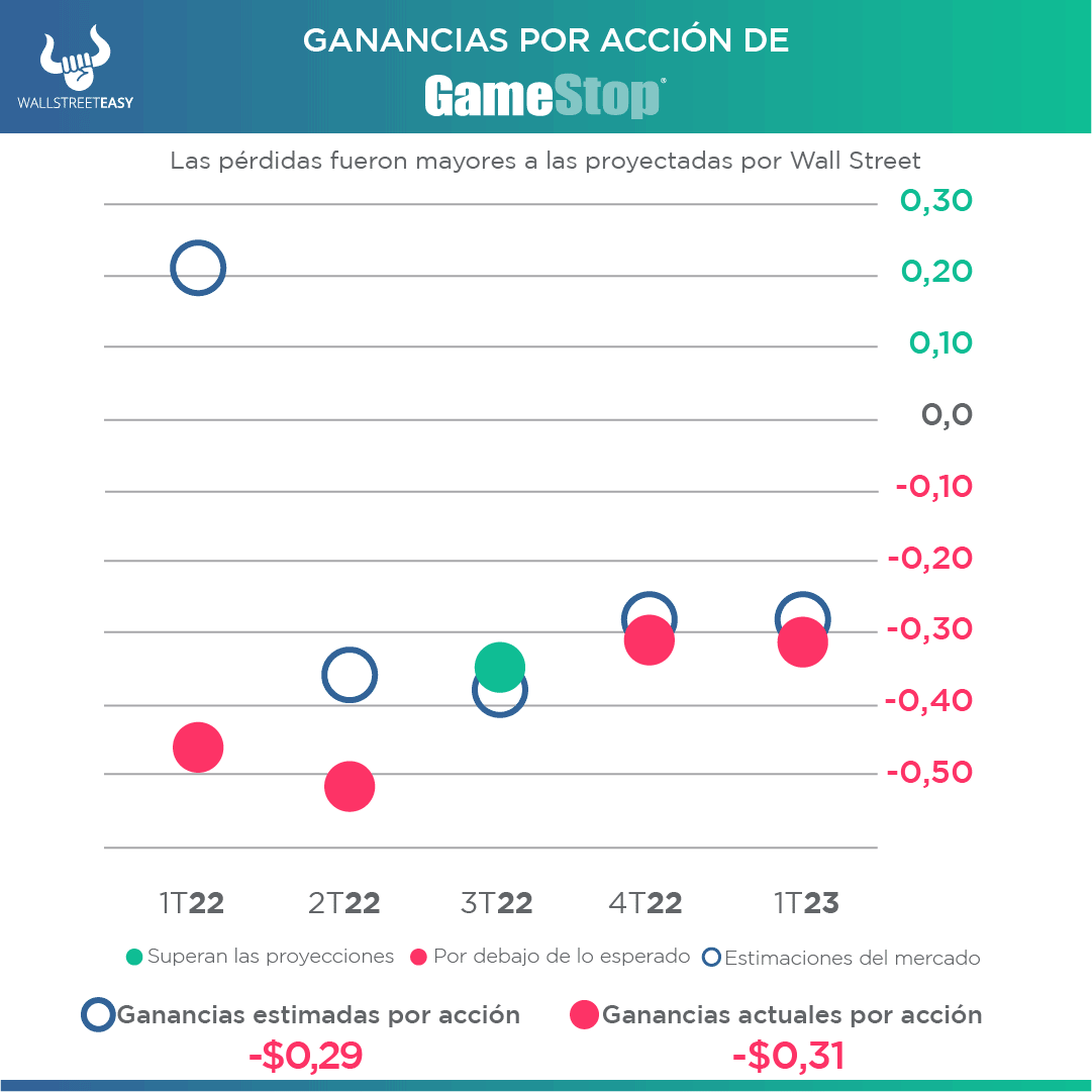 • Las pérdidas por acción de la empresa ascendió a $0,31 en el trimestre, peor que la pérdida esperada de $0,29. GameStop achacó su última pérdida de beneficios a la caída de los juegos a raíz de la pandemia del COVID-19. Las ventas en las tiendas físicas de la empresa también se han visto afectadas por el cambio de los jugadores de la compra de discos de juegos a las descargas digitales.