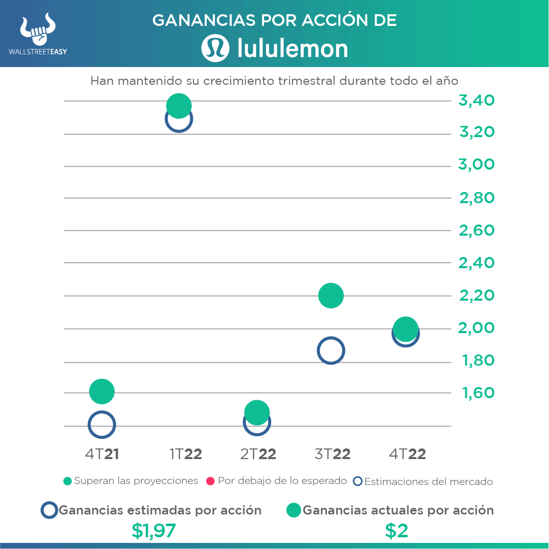 • Los ingresos netos del minorista de ropa deportiva en el trimestre ascendieron a $255,5M, o $2 por acción, frente a los $187,8M o $1,44 por acción de hace un año. Los ingresos aumentaron +28%, hasta $1.860M. Los analistas esperaban $1,97 por acción e ingresos de $1.810M.