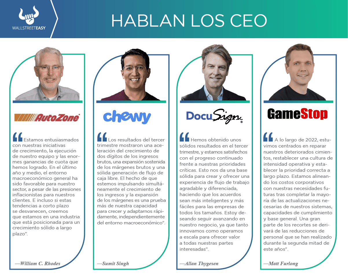 LA NOTICIA En una nueva semana de reportes de ganancias del tercer trimestre de 2022, veremos cómo les fue a AutoZone Inc. ($AZO); Chewy Inc. ($CHWY); Costco Wholesale Corp. ($COST); DocuSign Inc. ($DOCU); GameStop Corp. ($GME), y Lululemon Athletica Inc. ($LULU). PONME AL DÍA AutoZone superó las previsiones de ganancias e ingresos con sus resultados del primer trimestre, pero la inflación aumenta sus inventarios: