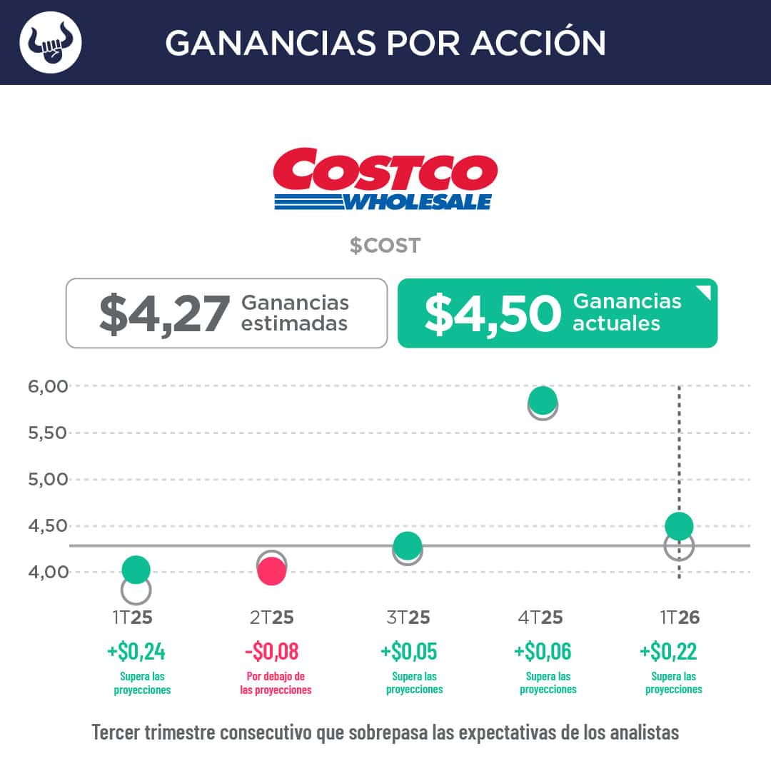 - El club de almacenes obtuvo unas ganancias por acción de $4,50 frente a los $4,27 esperados, e ingresos de $67.310M, por encima de los $67.140M estimados.