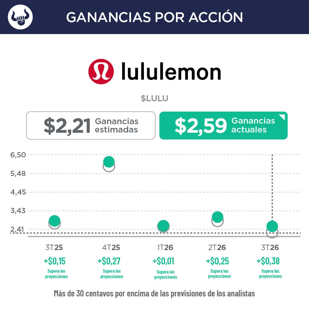 - A pesar de los buenos resultados, Lululemon publicó unas previsiones para el cuarto trimestre más moderadas de lo esperado. La empresa prevé un beneficio por acción en el cuarto trimestre de entre $4,66 y $4,76, por debajo de los $4,97 que esperaban los analistas.