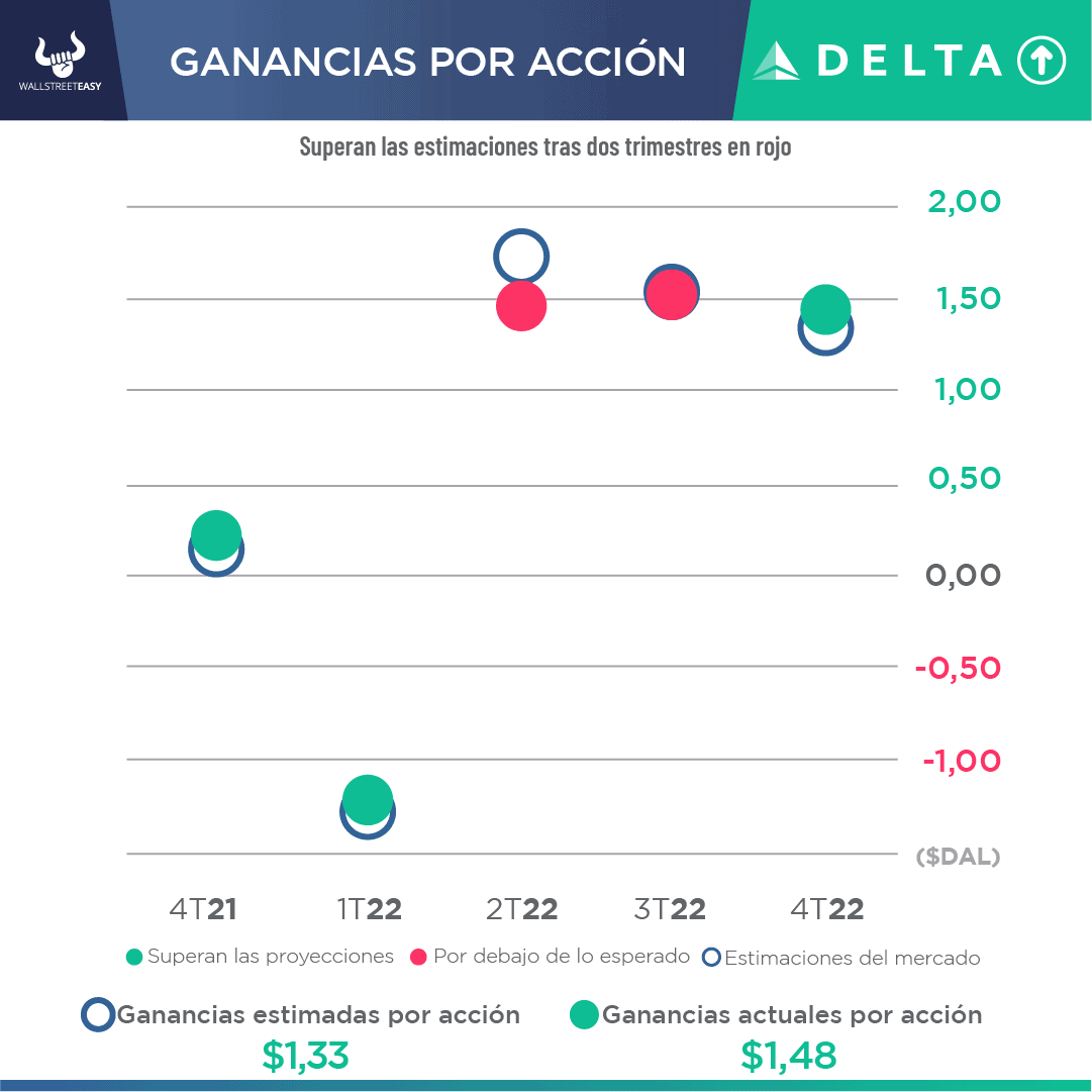 • Los beneficios ajustados por acción de la aerolínea fueron de $1,48 frente a los $1,33 esperados. Los ingresos ajustados alcanzaron los $12.290M, excluidas las ventas de refinería, frente a los $12.230M estimados. La aerolínea generó $13.440M en ventas totales en los tres últimos meses de 2022, +17% más que los $11.440M que ingresó tres años antes.
