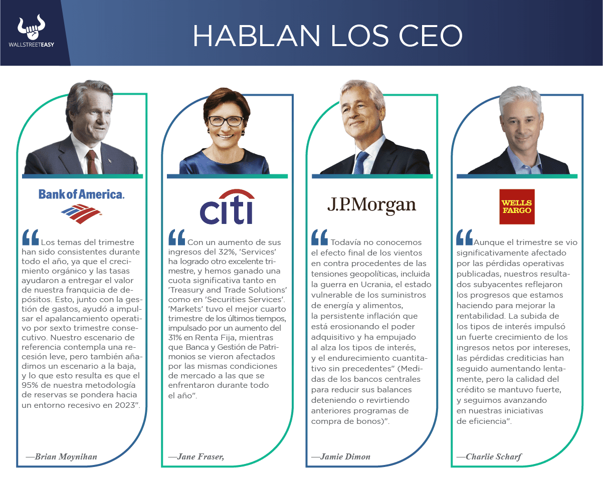 • Se suponía que Bank of America iba a ser uno de los principales beneficiarios de la campaña de subida de tipos de la Reserva Federal, pero las acciones bancarias se hundieron el año pasado ante la preocupación de que se avecinara una recesión. El banco dotó una provisión de $1.100M para pérdidas crediticias, $1.600M más que en el 4T21, pero afirmó que las insolvencias netas se mantienen por debajo de los niveles anteriores a la pandemia.