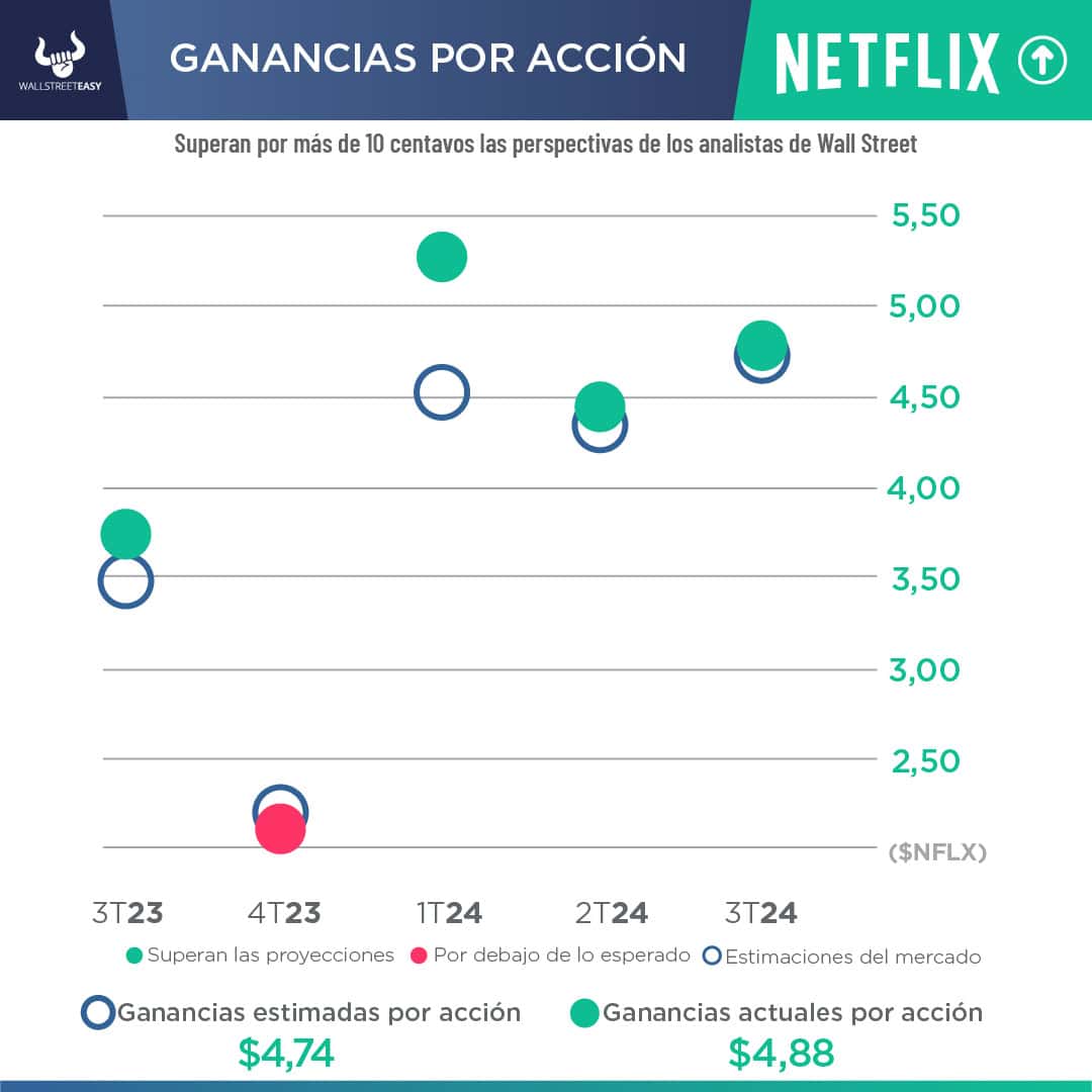 - La empresa de streaming registró un beneficio neto de $2.150M, o $4,88 por acción, frente a los $1.490M, o $3,29 por acción, del 2T23. Los ingresos ascendieron a $9.600M, +17% más que el año anterior, impulsados por el aumento del número medio de suscripciones de pago. Se esperaban $4,74 en beneficios por acción, e ingresos de $9.530M.