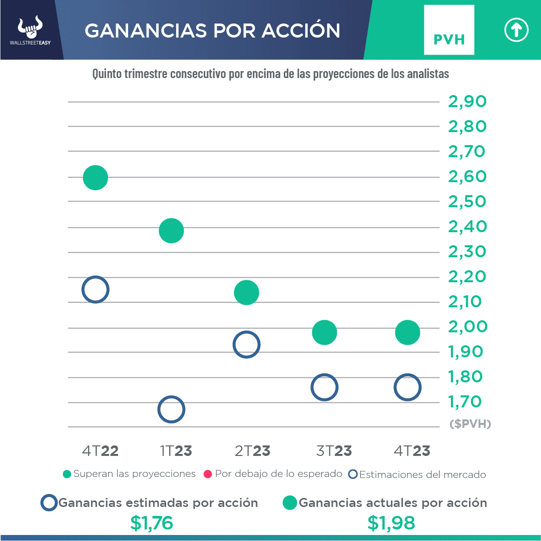 - Según PVH, se espera que el beneficio por acción del tercer trimestre se sitúe en torno a los $2,70 y que los ingresos aumenten en un dígito intermedio respecto al mismo periodo del año anterior. Para todo el año, la empresa prevé un beneficio por acción ajustado de $10,35 y un aumento de los ingresos de entre 3% y 4%.
