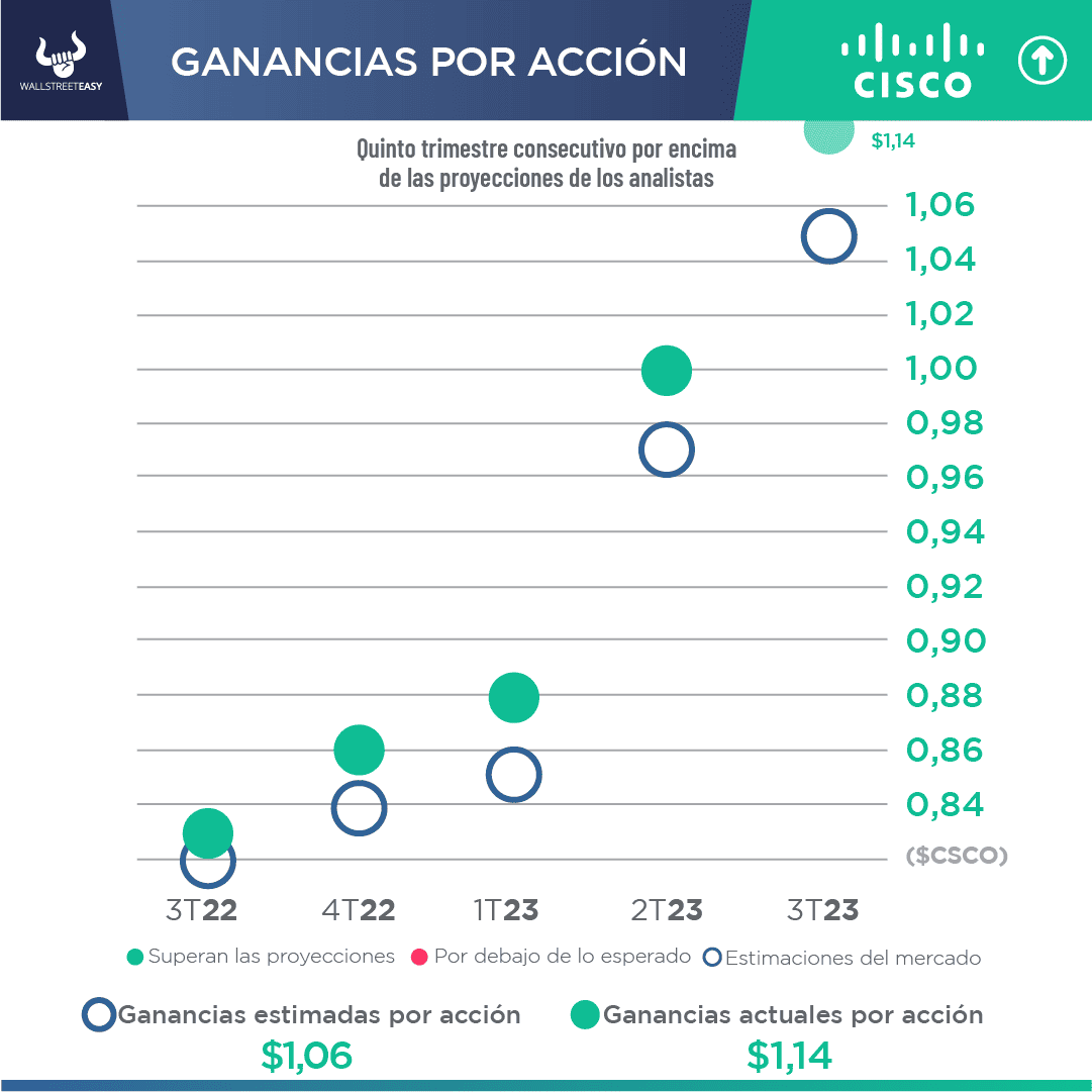 - Para el trimestre actual, que finaliza en octubre, Cisco espera que sus beneficios por acción oscilen entre $1,02 y $1,04, y estima ingresos de entre $14.500M y $14.700M.