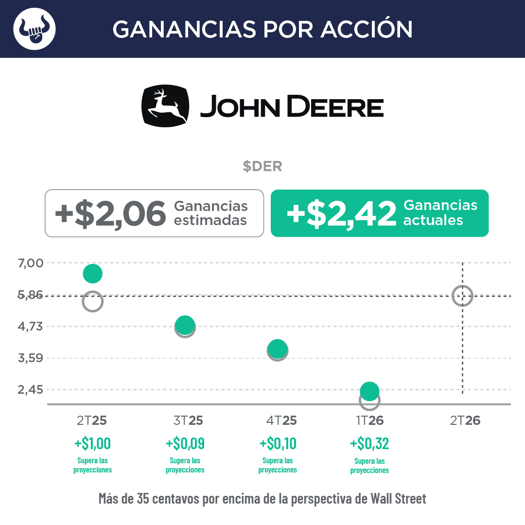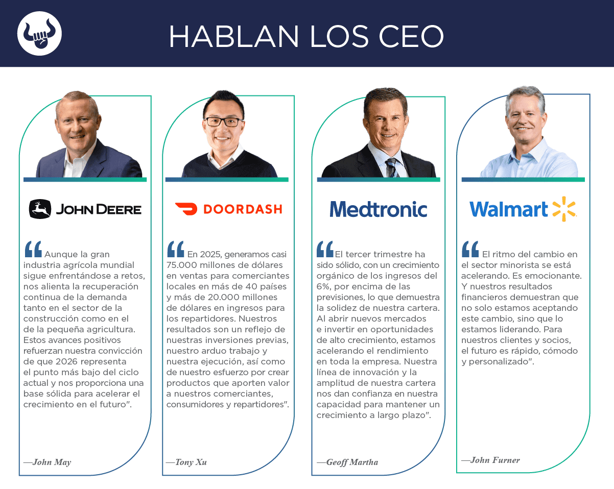 LA NOTICIA En una nueva semana de reportes de ganancias del cuarto trimestre de 2025, veremos cómo les fue a Deere & Co. ($DE), Doordash Inc. ($DASH), Medtronic Inc. ($MDT) y Walmart Inc. ($WMT). PONME AL DÍA Los resultados de Deere superaron las estimaciones, aunque siguieron registrando una fuerte caída con respecto al año anterior: