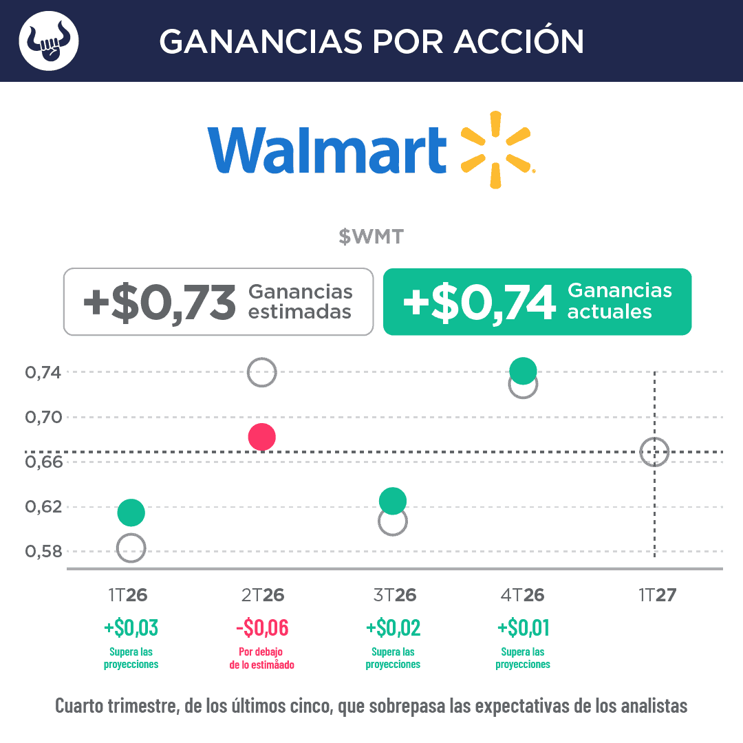 • El gigante minorista obtuvo unas ganancias por acción de 74 centavos ajustados frente a los 73 centavos esperados, e ingresos de $190.660M frente a los $190.430M esperados.