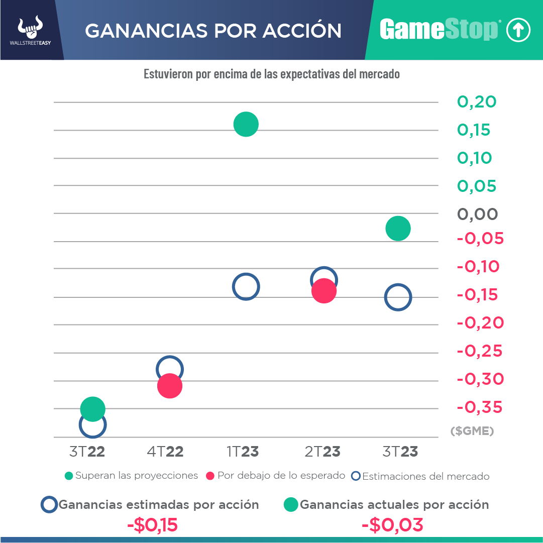 - El minorista de videojuegos tuvo una pérdida ajustada de 3 céntimos por acción, que superaron las expectativas. La estimación media era de una pérdida de 15 céntimos por acción. Además, obtuvo ingresos de $1.160M en el periodo, superando también las previsiones de $1.140M.