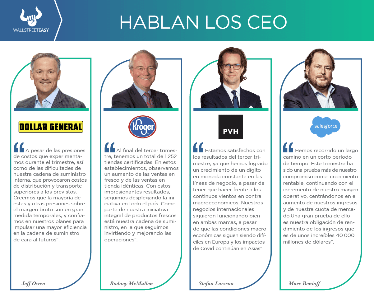 De las cuatro empresas que observamos para este reporte, solo la minorista Dollar General presentó resultados mixtos al no alcanzar sus beneficios por acción las expectativas de los analistas. Kroger mostró buenos números, debido a una mayor afluencia de clientes que buscan artículos de primera necesidad. Por su parte, PVH cumplió con lo esperado, aunque sigue resintiéndose de sus ventas en Ucrania, Rusia y China, mientras que Salesforce luce imparable tras un nuevo trimestre en positivo y al alza. Nos mantenemos atentos para traerles los mejores trades.
