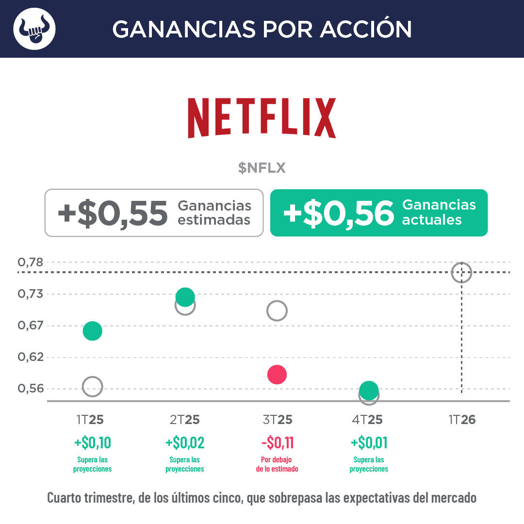 • El gigante del streaming obtuvo ingresos netos de $2.420M, o 56 centavos por acción, frente a los $1.870M, o 43 centavos por acción, del mismo periodo del año anterior ($55 estimados). Los ingresos de $12.050M superaron la previsión de $11.970M.