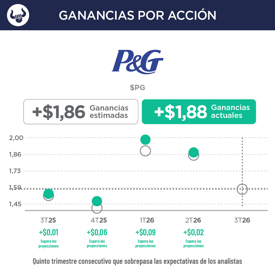 • El gigante de los productos de consumo obtuvo unas ganancias por acción de $1,88 ajustados frente a los $1,86 dólares esperados, e ingresos de $22.210M que no alcanzaron las previsiones de $22.280M.