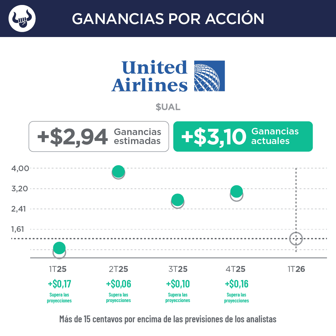 • La aerolínea espera unas ganancias ajustadas por acción de entre $12 y $14 este año, en línea con los $13,16 que esperaban los analistas. Para el primer trimestre, United prevé unas ganancias por acción de entre $1 y $1,50, mientras que los analistas habían estimado $1,13 por acción.
