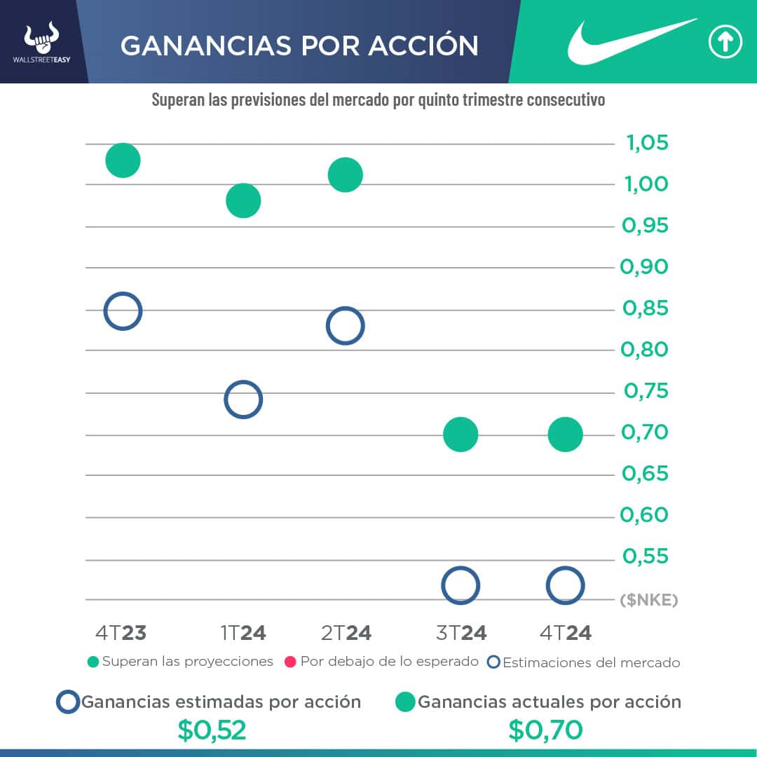- La empresa de artículos deportivos anunció beneficios de 70 centavos por acción, por encima del consenso de 52 centavos. El rendimiento superior se debió a una mejora general del margen bruto, que aumentó 1,2 puntos porcentuales hasta el 45,4% gracias a los menores costos de producción y a los aumentos de precios del año pasado.