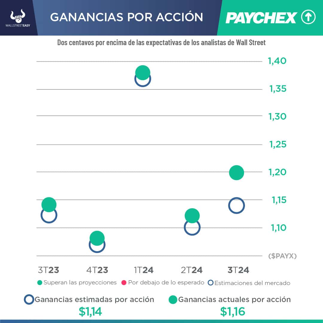 - El proveedor de servicios de recursos humanos obtuvo un beneficio ajustado de $1,16 por acción, que superaron las expectativas de Wall Street de $1,14 por acción, e ingresos de $1.320M, por encima de las previsiones de $1.310M.