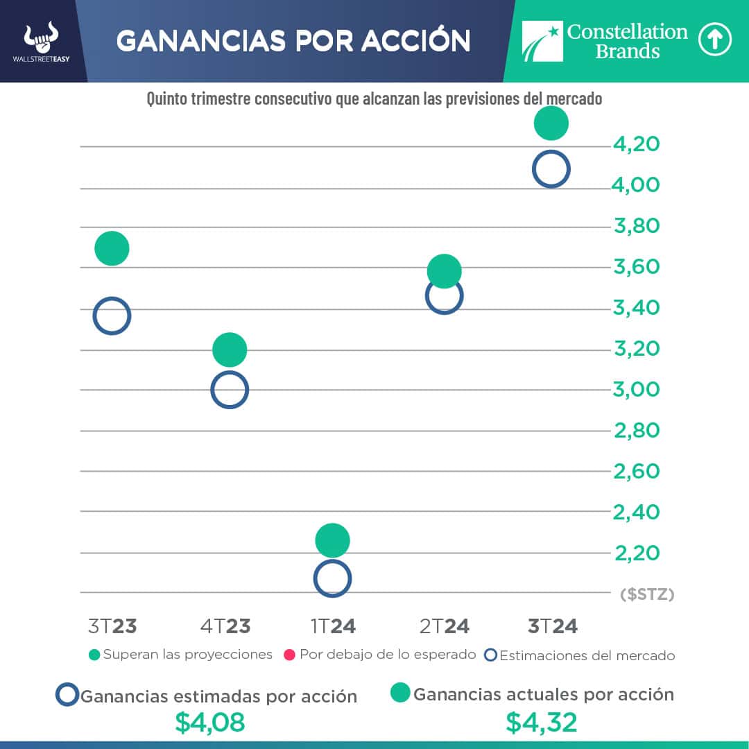 - El fabricante de bebidas alcohólicas obtuvo un beneficio ajustado de $4,32 por acción, superando la previsión de Wall Street de $4,08. Las ventas netas, de $2.920M, fueron inferiores a la previsión de consenso de $2.950M.